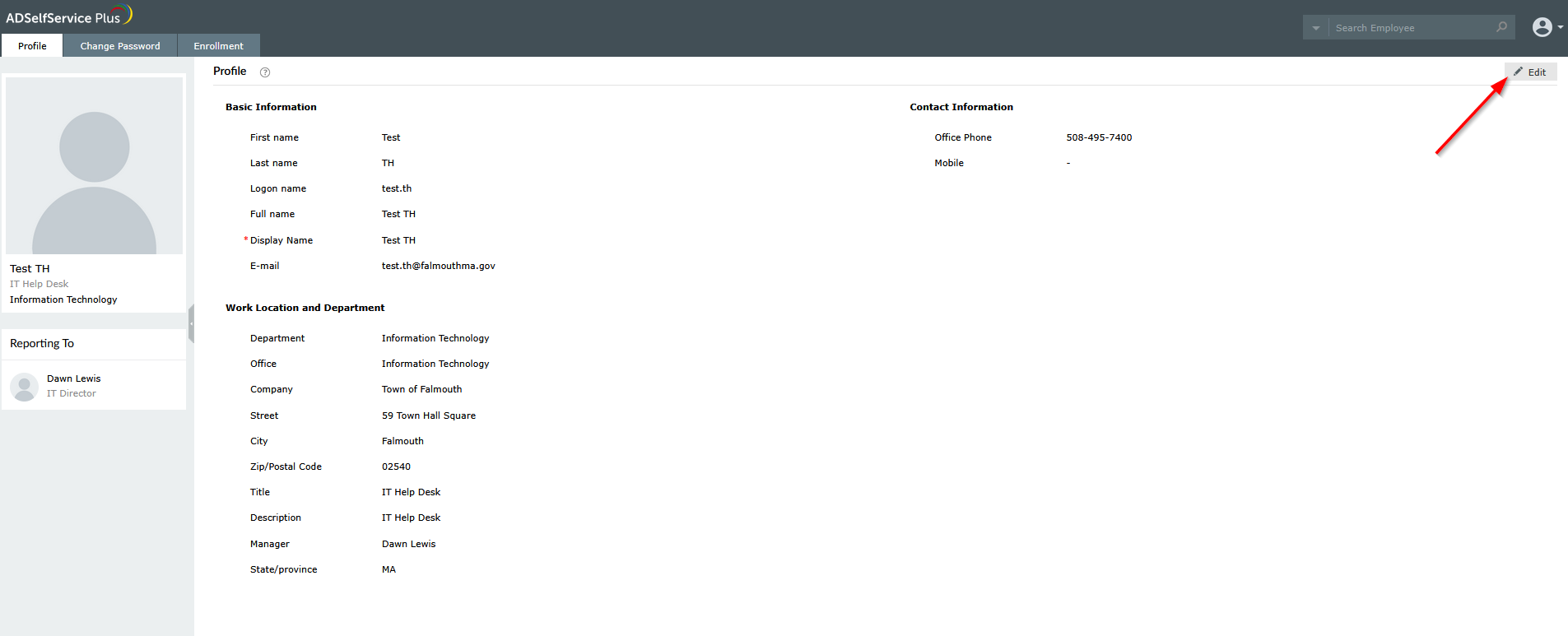 The Town of Falmouth has implemented a method to update your profile information should you need to update any of your profile information. This information is synced across both your Windows/Domain account and your Microsoft 365 Email. This method only works when you are connected to the network at any Town of Falmouth location and are using a town-provided device.